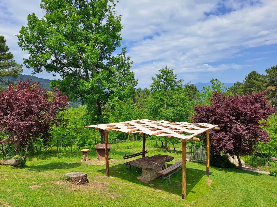 L'intera area del Casolare è recintata per un ettaro e al suo interno oltre ai giardini troverete olivi, un frutteto, la piscina e una zona barbecue con un tavolo in pietra adatto per i vostri pranzi e cene.
