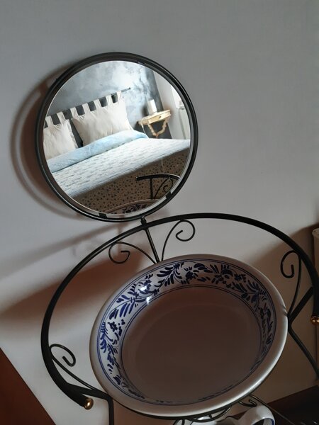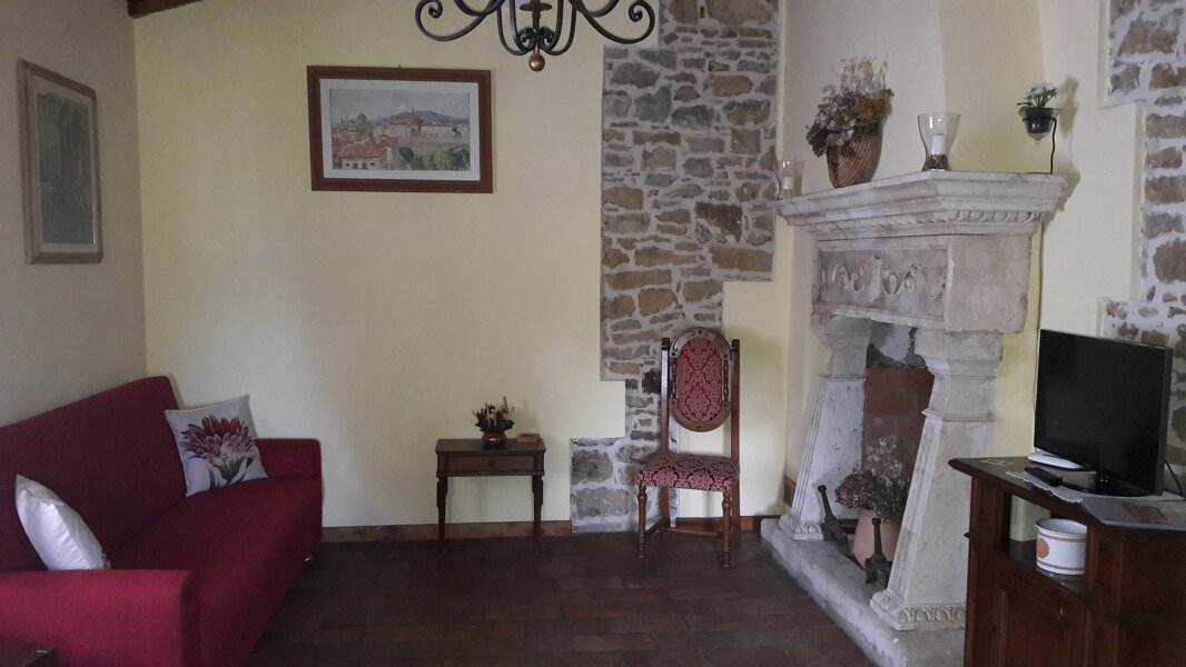 Questo appartamento può ospitare comodamente 6 persone, si trova al primo piano ed ha il suo ingresso indipendente che tramite un'ampia scala conduce nel salone. In questa stanza, dalla quale si gode di una fantastica vista sui giardini, è presente un antico camino in marmo perfettamente funzionante, il divano letto ad una piazza e mezzo e la TV a schermo piatto. Nella stanza adiacente, a vista, divisa da una arco, c'è la cucina con il tavolo.