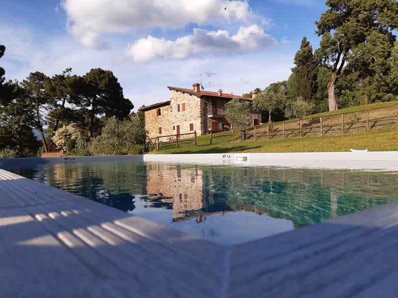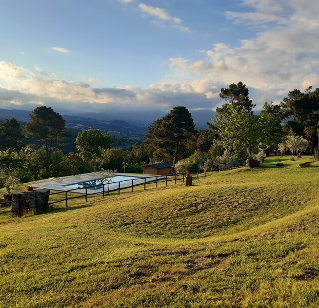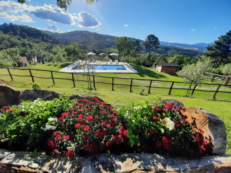 ends right here. What will present itself to your eyes is one typical Tuscan stone structure surrounded by green gardens and completely fenced for more than one hectare. Inside, in addition to the well-equipped gardens there are large green lawns and you can enjoy both full sun spaces and the natural shade of our plants.